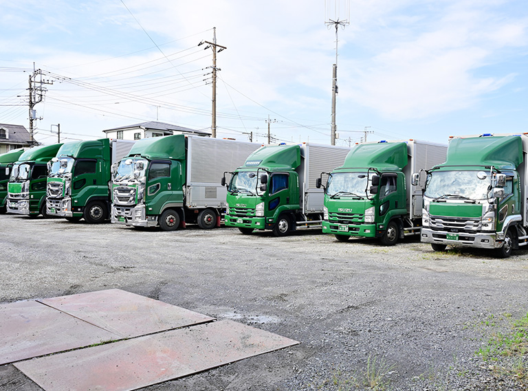 49台(令和6年8月時点) 14tウイング車 11台 (本社5台 茨城営業所6台) 7tウイング車 4台 (本社2台 茨城営業所2台) 4tウイング車 9台 (本社7台 茨城営業所2台) 4t平ボディー車 1台 (本社1台) 3t平ボディー車 16台 (本社3台 茨城営業所1台 香取営業所 12台) 2t平ボディー車 7台 (本社5台 茨城営業所2台) 2t箱車 1台 (本社1台) |